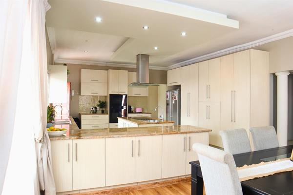 Step outside to a large, secure garden featuring a tranquil water feature and a covered patio perfect for enjoying South Africas beautiful climate. The property offers five garages plus additional secure parking, making it ideal for multiple vehicles, caravans, or recreational equipment.