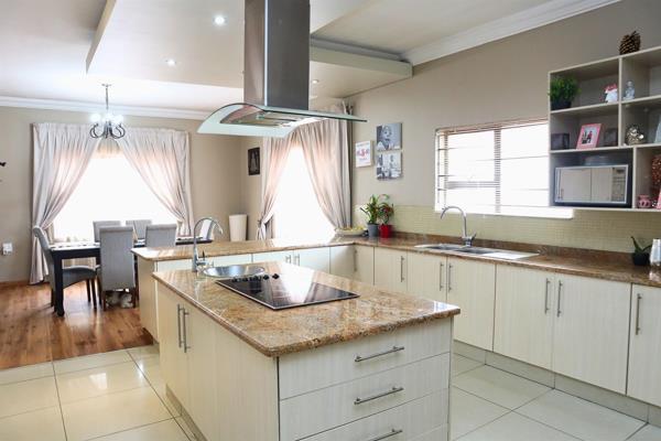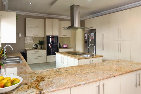 The open-plan kitchen is both stylish and functional, fitted with granite countertops, an eye-level oven, ample cabinetry, and a separate scullery. A dedicated laundry room and domestic accommodation with its own bathroom add further convenience.