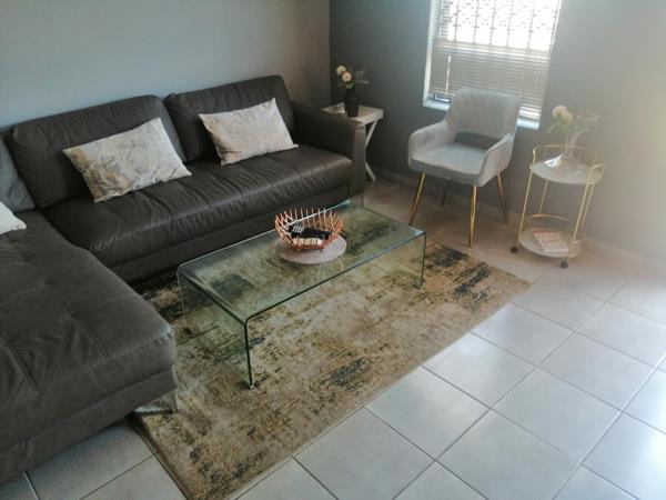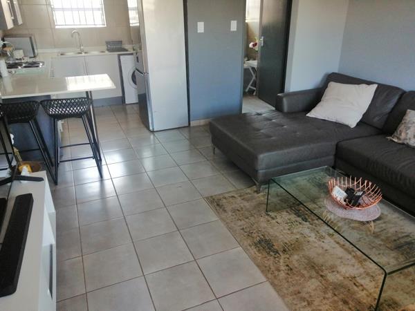 It offers two bedrooms with modern tiles and built-in cupboards, one bathroom, a lounge area, and a modern kitchen, fitted with blinds.