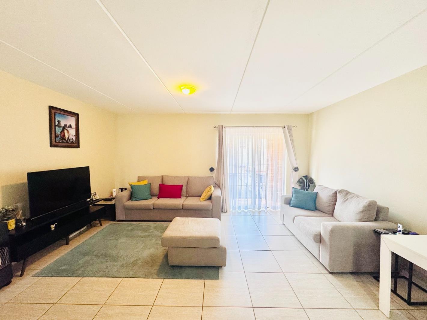 Discover this inviting 79 sqm residence located in a well-maintained complex in Groblerpark, Roodepoort. This modern home features an open-plan layout designed for comfortable living. The spacious lounge area, illuminated by ample natural light from large sliding doors, seamlessly connects to a dedicated dining space and a contemporary kitchen. The kitchen boasts light wood cabinetry, dark countertops, and includes space for essential appliances, all set against durable tiled flooring.