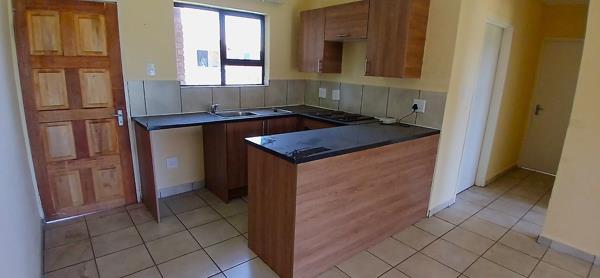 Kitchen features cupboards with modern finishes and inlet for a front loader washing machine.