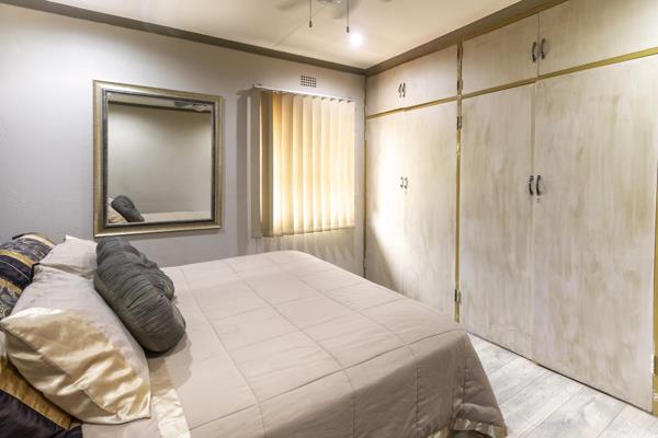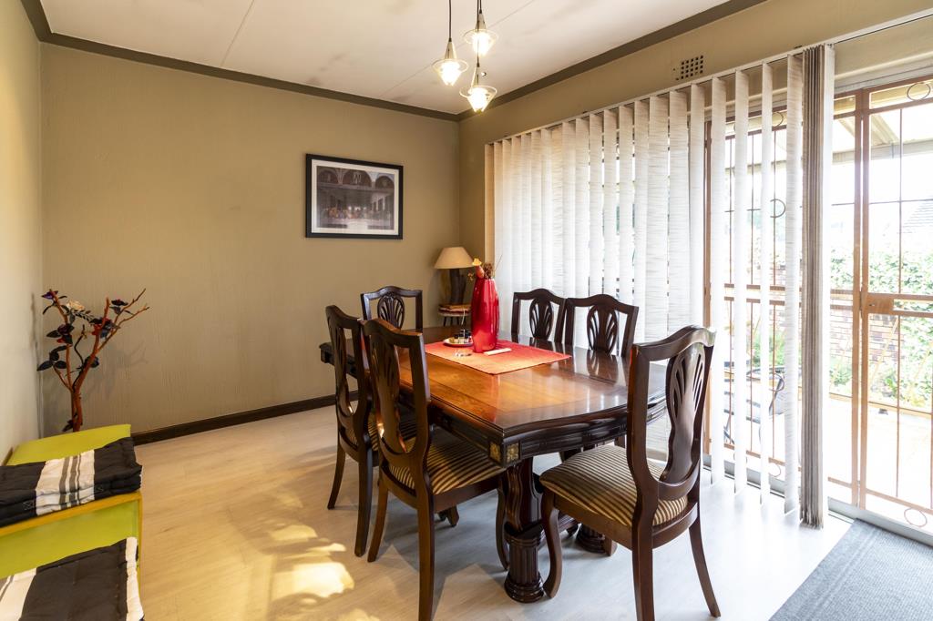 The living area boasts a spacious lounge and dining room, both featuring laminated floors, blinds, and ceiling fans. For those cooler Randburg evenings, underfloor heating is installed in both rooms. The dining room seamlessly extends to a covered, tiled patio, perfect for enjoying the neat, tranquil garden.