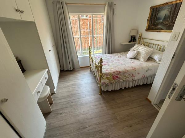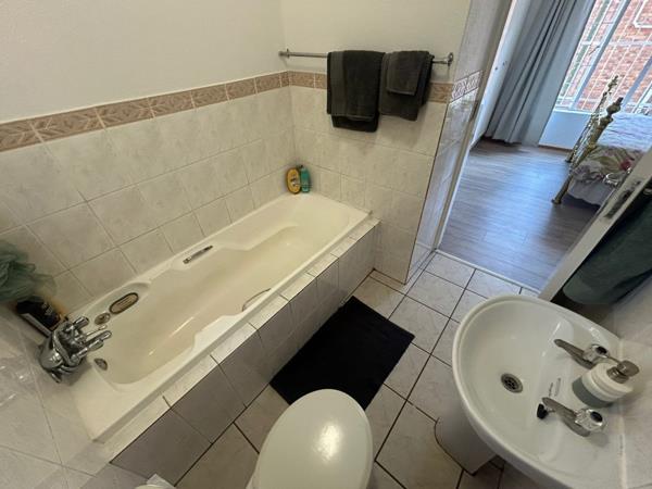 This is a small complex with 26 units located in a popular suburb. The home features a living area suitable for a small dining table and a kitchen with ample cupboard space. There are two bedrooms downstairs with beautiful laminated flooring, both with built-in cupboards. Two bathrooms: one on-suite with a bath and another with a shower. Additional amenities include a single garage and a carport in front of the garage.