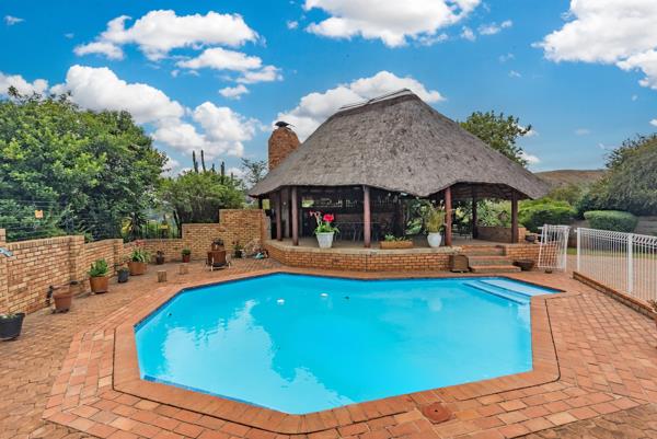 The outdoor area is perfect for entertaining, complete with a patio, entertainment lapa, lush garden, and sparkling pool.