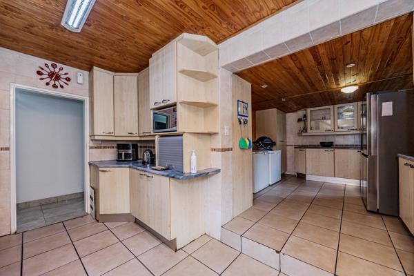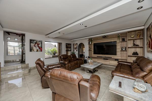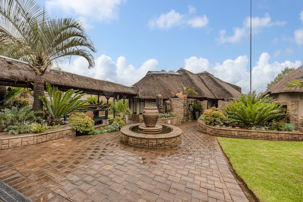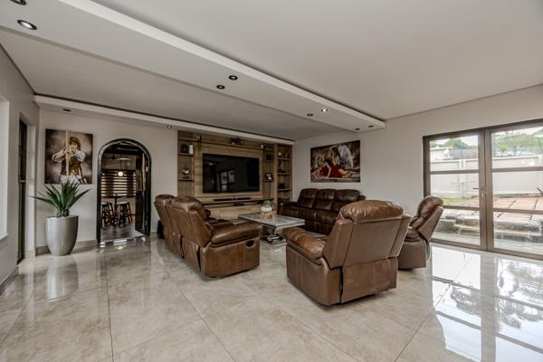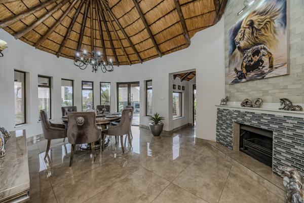 An impressive enclosed entertainment area with a built-in bar and pool table opens onto a covered patio with a built-in braai, overlooking the swimming pool with its own bathroom.