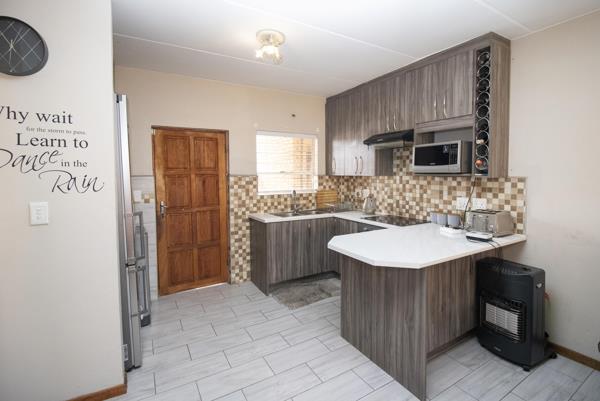 The heart of the home is a modern, well-appointed kitchen with ample cupboard space, designed to make both everyday cooking and entertaining a pleasure. It flows seamlessly into the open-plan living area, where natural light fills the space and creates a warm, inviting atmosphere. From here, sliding doors open directly onto your covered patio, extending your living space and offering the perfect spot for relaxing or dining al fresco.