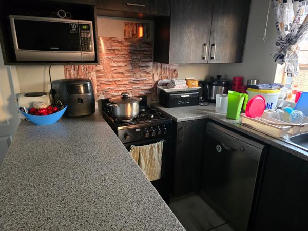 A compact kitchen boasts plenty of cupboard space and under-counter appliance.