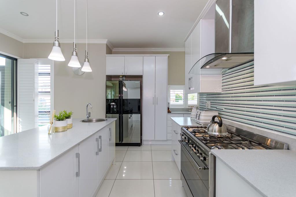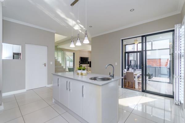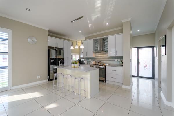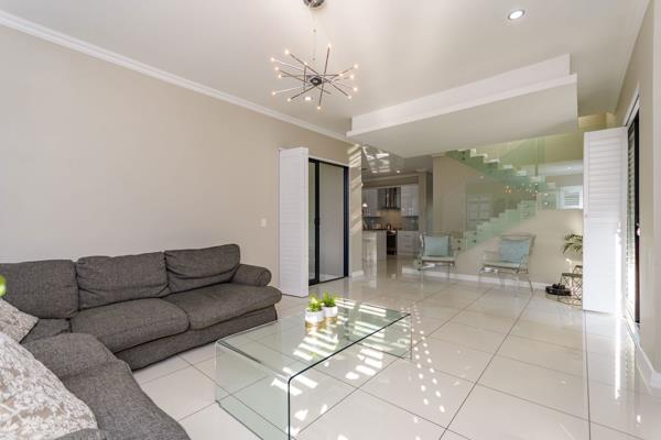 The stunning open plan kitchen is the heart of the home, featuring quartz countertops, ample appliance space, and seamless flow into the living and dining room areas . The living room is enhanced by American shutters and aluminium-framed sliding doors, opening onto a beautiful garden and sparkling poolideal for entertaining or relaxing outdoors.