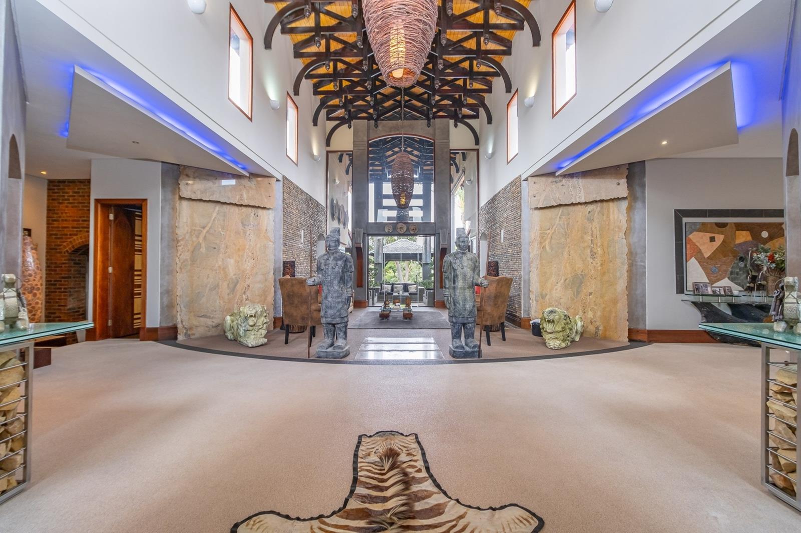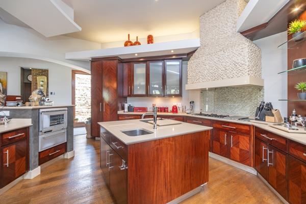 The home offers 6 bedrooms, 5 bathrooms, one of which includes a full cottage as well as 3 kitchens, a private cinema room, and endless entertainment options. Explore 3 sophisticated lounges, 3 dining areas, a dining wine cellar, an entertainment cavern, and a dream pool area with an expansive patio and pub. The pristine, meandering garden provides the perfect backdrop for hosting or relaxing. Additional features include two spacious private helpers rooms, ensuring practicality meets extravagance.