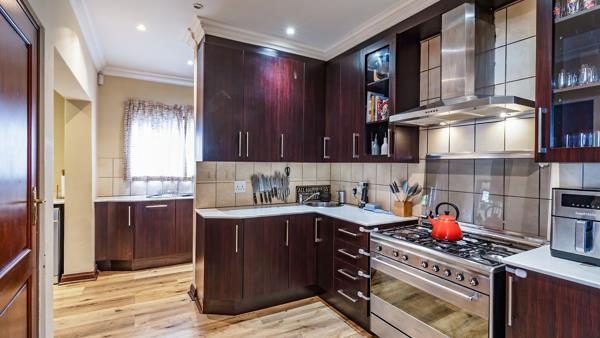 The heart of this home is the chefs dream kitchen, featuring modern finishes, a gas hob and oven, sleek quartz countertops, abundant cupboard space, a large pantry, and a dedicated coffee station, not to mention the large scullery which provides additional workspace and direct access to the tiled, automated double garage, as well as a handy storage space tucked neatly under the staircase.