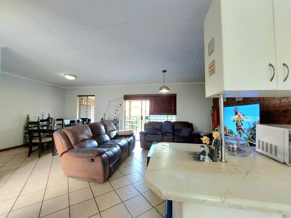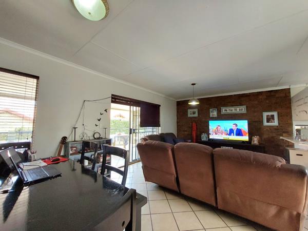 Gorgeous tiled open-plan living/ dining area with sliding doors onto covered patio with a built-in braai.