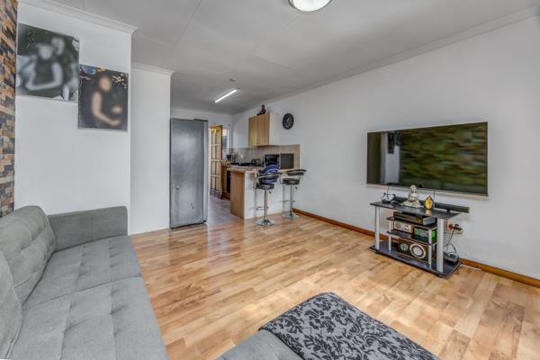 The open plan kitchen is tiled and the living area and both bedrooms have laminated floors.