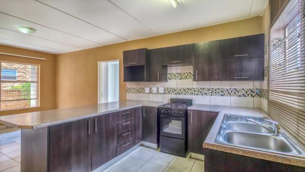 The contemporary open-plan kitchen offers ample cupboard space and accommodates two under-counter appliances, ensuring both practicality and style. The living area flows seamlessly onto a covered patio and private garden, creating an ideal space for family braais, entertaining guests, or simply relaxing. For added convenience, the patio door is fitted with a small pet door, making it suitable for a cat or a small dog.