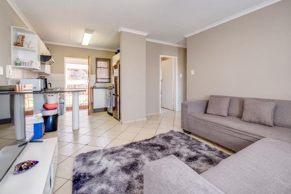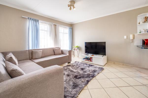 The unit offers a functional, open-plan kitchen with space for two appliances and a single-door fridge. The sunny lounge is generously sized and filled with natural light through large windows. Fully tiled throughout, the apartment is designed for low-maintenance living.