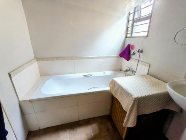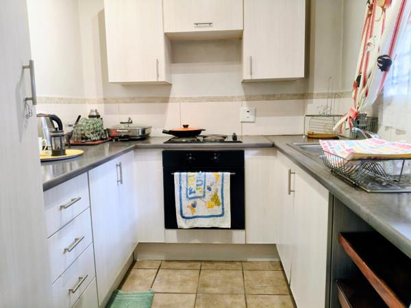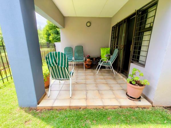 The kitchen is neat and functional with built in cupboards and flows into an open plan living area that provides ample space for a dining table, chairs, lounge suite and a TV unit. The living area opens onto a private patio that leads to your own exclusive garden, ideal for relaxing outdoors or enjoying weekend braais. There are two bedrooms, both fitted with built in cupboards. The main bedroom has an ensuite bathroom with a bath and a shower. The second bathroom features a shower only.