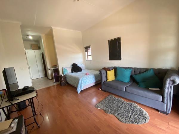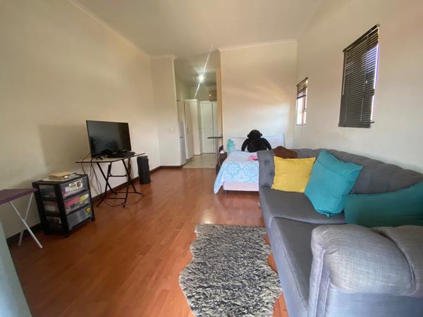 The apartment features an open-plan bedroom and lounge area with laminated wooden flooring, creating a warm and modern feel. The neat kitchen is fitted with built-in cupboards, offering practical storage and functionality.