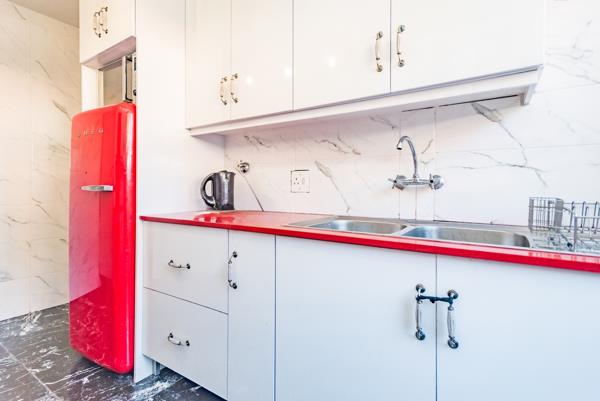 There is ample cupboard space in this delightfully bright kitchen, which leads into a private courtyard.