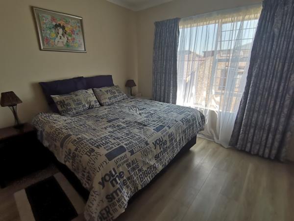 The townhouse comprises three generously sized bedrooms, each adorned with laminated floors and equipped with built-in cupboards. The luxurious main bedroom boasts an en suite bathroom for added comfort and privacy. An additional full bathroom with shower, basin, and toilet serves the remaining bedrooms and guests alike.