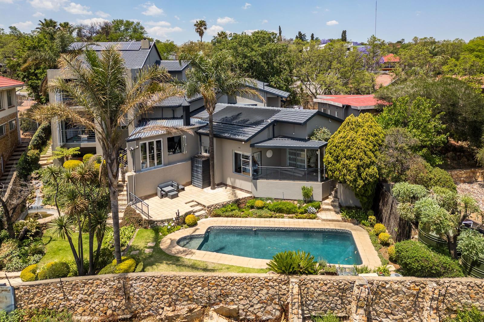 There''s a game or billiards room down the passage and a storage room under the stair casing leading to the master bedroom that boasts an entrance hall with a kitchenette, big separate office, a luxurious state of the art bedroom with a private lounge and multi-glazed folding windows overlooking breathtaking picturesque views right from the space of your own bedroom, in addition, an impeccably designed en-suite with a double shower and free standing bath with double basins. a his and hers boutique walk in closet separates the bedroom from the en-suite. Optimal safety and convenience is prioritized with the convenience of a 20 KWA Inverter, 8.5KWA Batteries, 12 Solar Panels and solar pool heating panels (please take note that the owner has since dropped the purchase price hence the Inverter, Batteries and Solar Panels is optional extra and up for negotiation), 2 X 19kg gas cylinders, 2 X 5000 litre JOJO Water Tanks, a borehole and irrigation system is also installed. Additional outbuildings includes a domestic quarters with 1 bed, shower, basin, toilet BIC''s, small kitchenette and then in the basement there''s a potential gymnasium . A sparkling swimming pool invites you to embrace cherished and valuable moments surrounded by a beautiful landscaped garden and a serene environment with spectacular views. A triple automated garage and 4 more vehicles can park comfortably in-front on the garages.