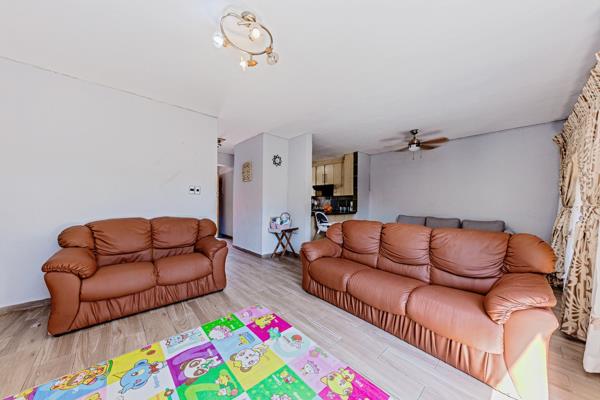 Step inside to a tiled kitchen featuring sleek granite countertops, ample cabinetry, and a cozy breakfast nookperfect for morning coffee or casual meals. The open-plan lounge and dining area, finished with laminated flooring, create a warm and inviting space that flows effortlessly to the private garden.