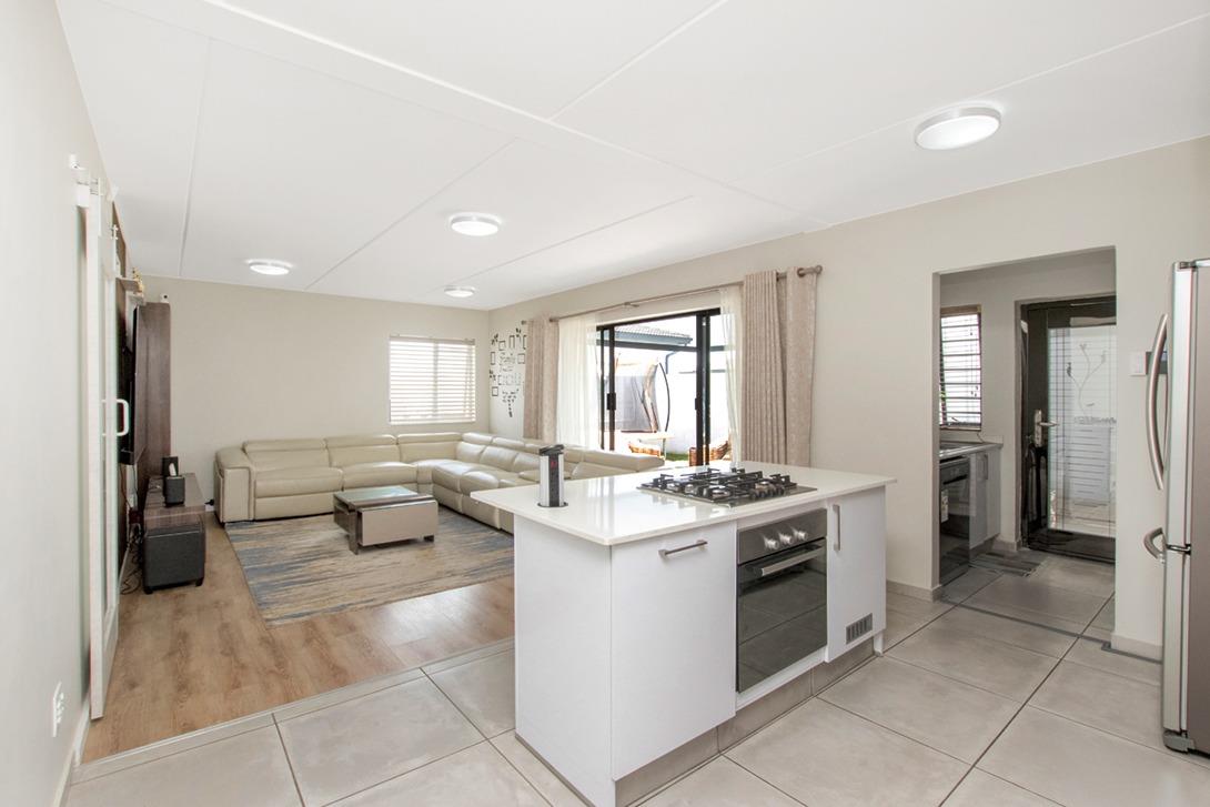 The heart of this home is its open-plan living and kitchen area, designed for seamless entertaining and daily life. The modern kitchen boasts a central island with an integrated gas hob, oven, and a convenient pop-up power outlet, complemented by stylish two-tone cabinetry and pristine white countertops. Stainless steel appliances, including a dishwasher, enhance its appeal. The adjacent lounge area, featuring durable wood-look flooring and a media wall, is bathed in natural light from large sliding doors that open directly to an outdoor patio.