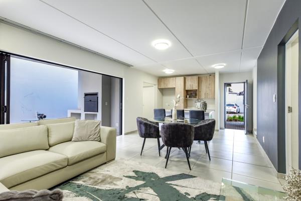 The lounge exudes sophistication with automatic curtain rails, adding a modern touch to the space. Large glass doors open to a covered patio with built-in braai perfect for everyday dining or relaxed Sunday lunches with family and friends. The home is ideally located on the border of the park, allowing little ones to play safely and freely, while beautiful mountain views create a tranquil backdrop right at your doorstep.