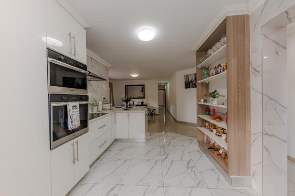 The interior boasts an inviting entrance hall leading to an open-plan layout. The heart of the home is a sleek, modern kitchen featuring high-gloss white cabinetry, elegant marble-look tiles, integrated double ovens, a hob, and an extractor. A convenient pantry and a breakfast bar enhance functionality, while the space flows seamlessly into a dedicated dining area. Two comfortable lounges, including a family TV room, provide versatile living spaces for relaxation and social gatherings, all benefiting from abundant natural light.