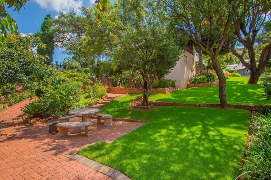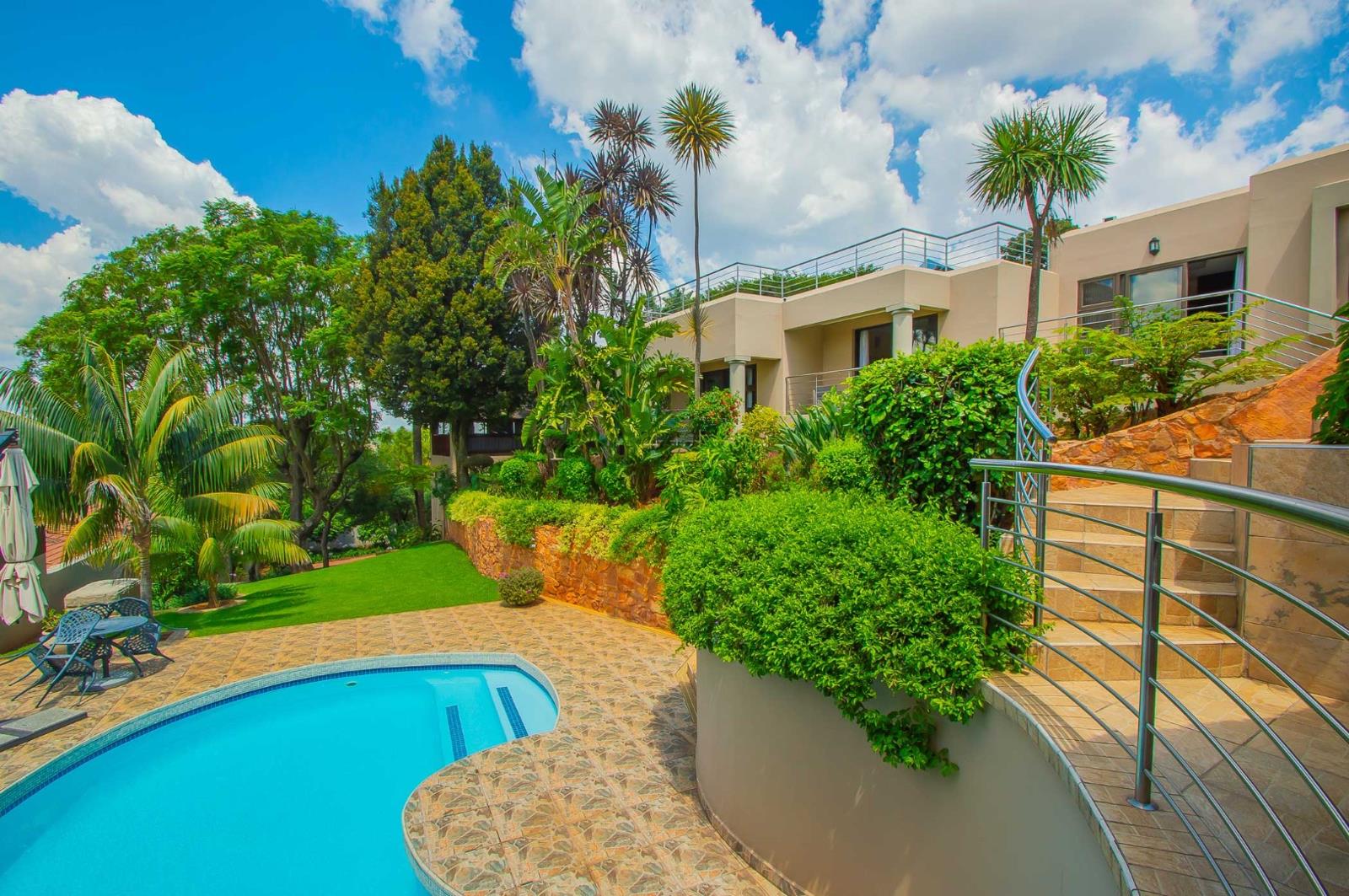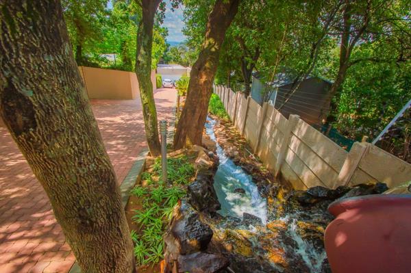 The garden is equally impressive with diverse kinds of fruit trees, a Koi water fountain feature running the length of the driveway, garden lighting. A massive outdoor entertainment area with a large tiled lapa fitted with roller blinds, a convenient wash-up basin, and views over the heated swimming pool with tiled surrounds and stainless-steel railings.