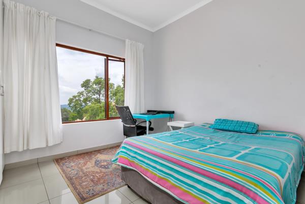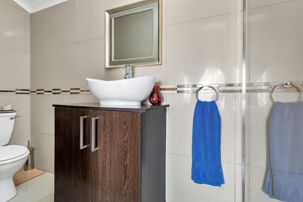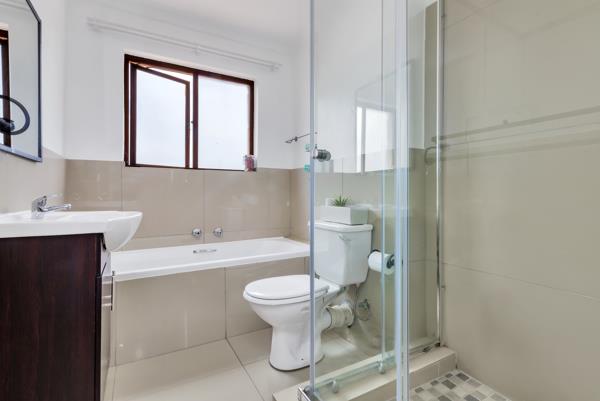 Two well-sized bedrooms are positioned downstairs, both filled with natural light, offering built-in cupboards and pleasant outlooks. They share a neat bathroom fitted with both a bath and shower. Tucked discreetly next to this bathroom is a separate laundry area, keeping practical day-to-day tasks out of sight.