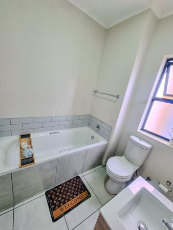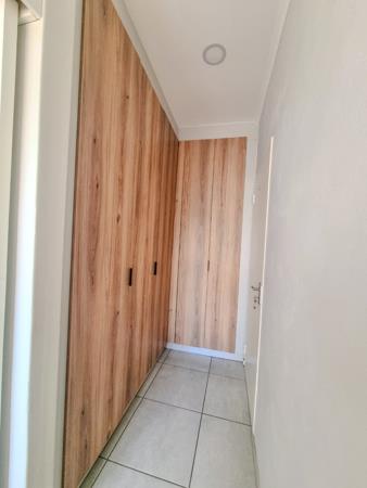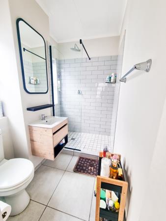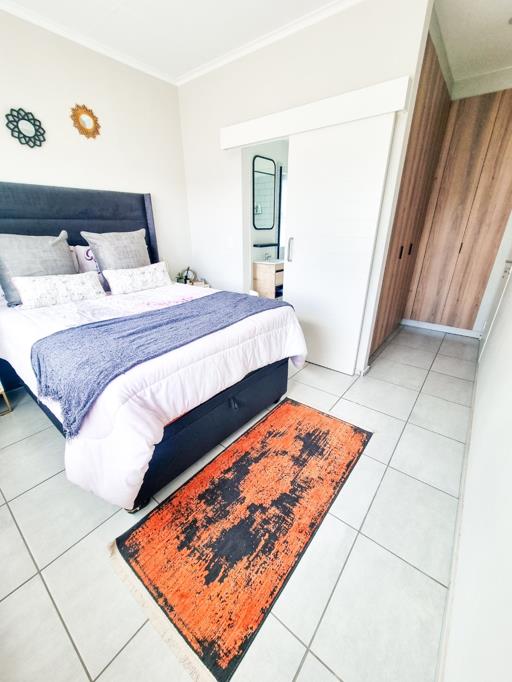 The kitchen is both practical and stylish, offering ample cupboard space and fitted with a gas stove perfect for convenient cooking and uninterrupted meal preparation during loadshedding. The open-plan layout flows seamlessly into the living area, creating a welcoming space for relaxing or entertaining.