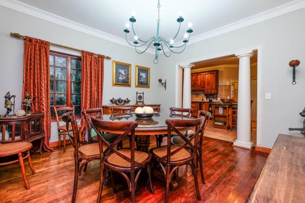 Downstairs, the home welcomes you with a warm and inviting entrance hall leading into a spacious and practical layout. The main lounge, fitted with a gas fireplace, which leads into a spacious kitchen with an adjoining dining area, pantry, and separate scullery. Designed with entertaining in mind, the second lounge opens up to a built-in bar and a patio overlooking the pool and garden. Additional features include a wine cellar, as well as both indoor and outdoor built-in braai areas perfect for hosting in any season.