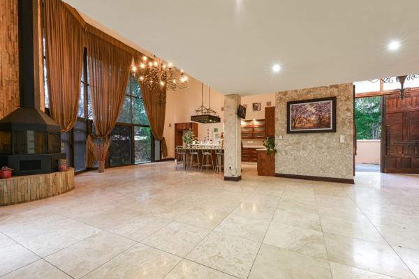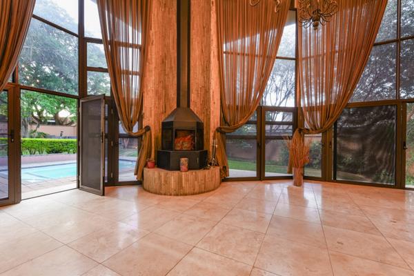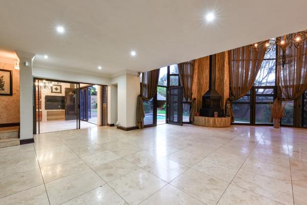 This expansive lounge is a statement of elegance, with soaring ceilings, floor-to-ceiling windows draped in luxurious curtains, and ample natural light. A feature fireplace surrounded by warm wood paneling creates a cozy ambiance, while recessed lighting and a chandelier enhance the rooms refined atmosphere. Polished tile flooring and large sliding glass doors provide access to the outdoor garden and pool, perfect for indoor-outdoor living and hosting gatherings. This lounge is a true blend of style, space, and function, making it a standout feature of the home.