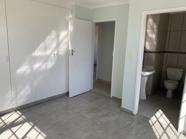 The main bedroom is generously sized and tiled, with ample built-in cupboard space. It includes a well-proportioned en-suite bathroom with a bathtub.