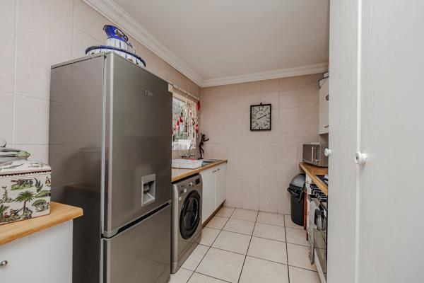 The living area is spacious and designed in an open-plan layout that flows into the kitchen. The entire unit is tiled throughout, adding to the neat, low-maintenance appeal. The kitchen accommodates a fridge as well as one additional appliance, such as a washing machine or dishwasher.