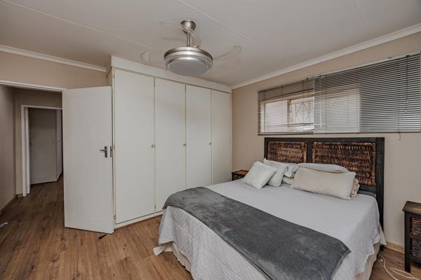 The lounge and both bedrooms are finished with laminate flooring. The kitchen is practical and well-designed, offering generous cupboard space and room for two appliances. Both bedrooms are generously sized, comfortably fitting queen-size beds, and include built-in cupboards. The main bedroom also has sliding door access to the patio.