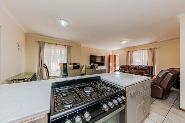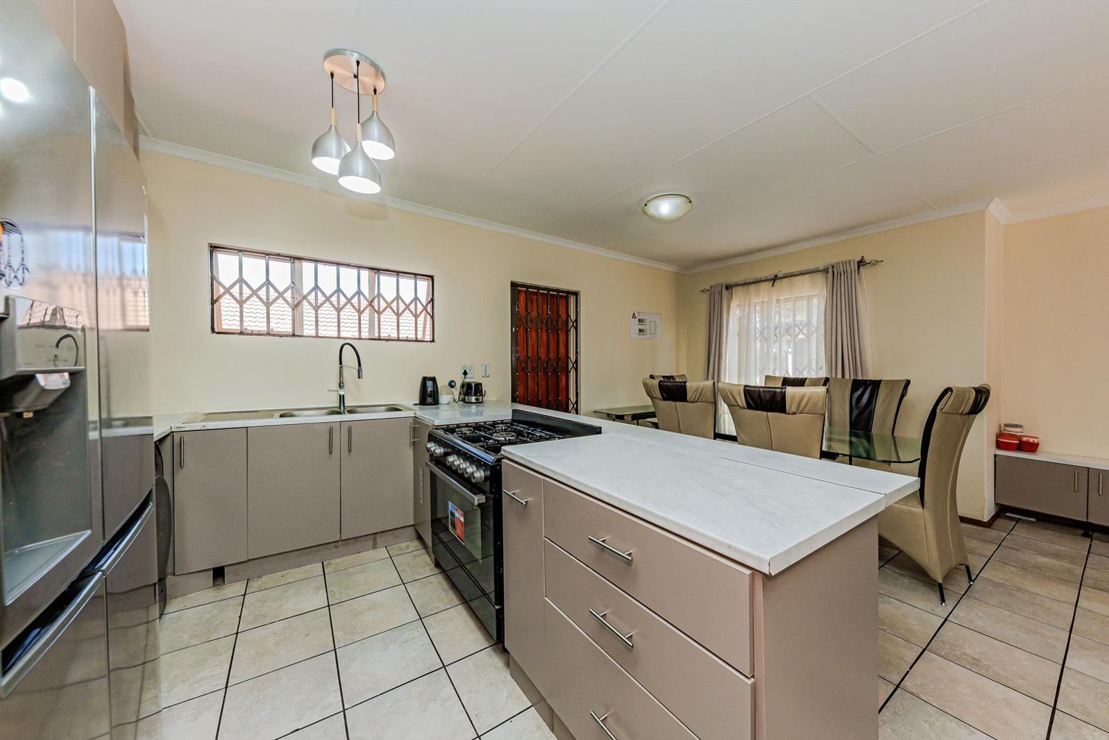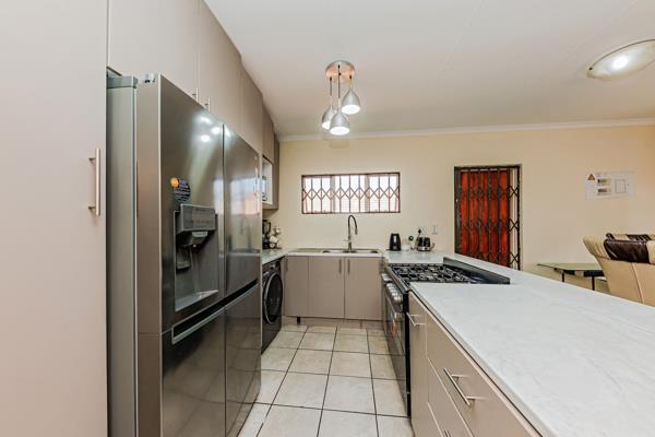 This lovely townhouse has a very spacious open plan lounge leading directly into dining room and a very modern kitchen. Tiled. The kitchen is fitted with a gas stove and has space for a double fridge.