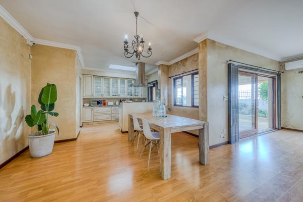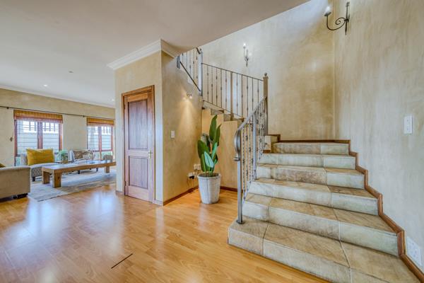 Upstairs, an impressive stairway with an artistic steel balustrade with storage cum wine cellar on the ground floor, leads up to a luxurious master suite with an open-plan bathroom and balcony overlooking the rolling greens of Ruimsig.