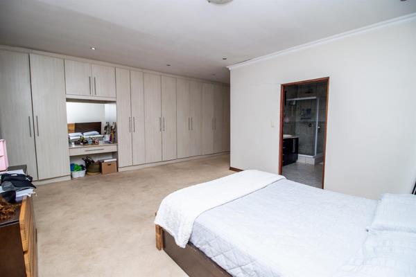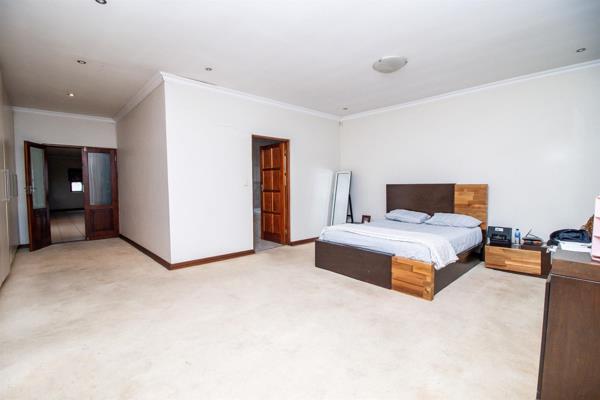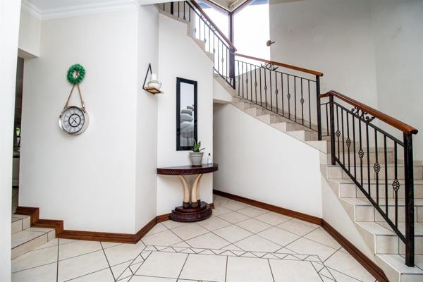 A dedicated entertainment area boasts a built-in braai and full glass doors opening onto the sparkling pool area, ideal for hosting guests or enjoying family gatherings.