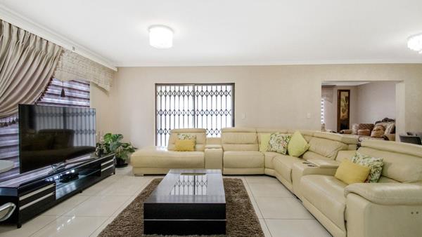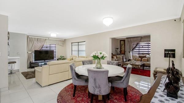 The expansive lounge exudes warmth and comfort, seamlessly flowing into a second lounge area and an open-plan dining space. From here, the living area opens onto a covered patio, complete with a built-in braai, a perfect spot for enjoying outdoor living and the sparkling swimming pool.