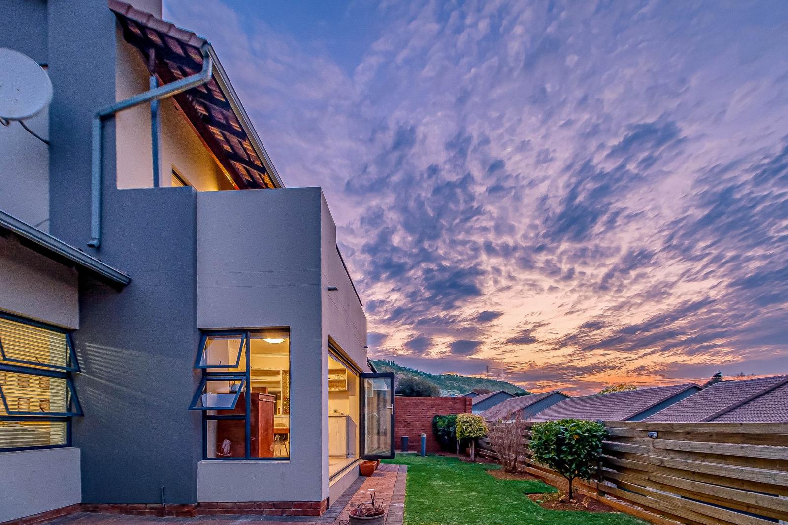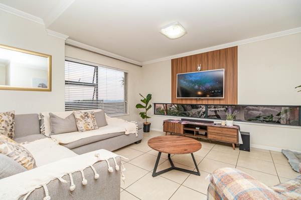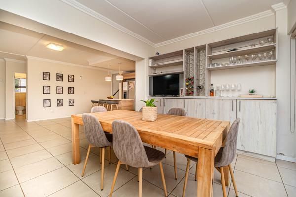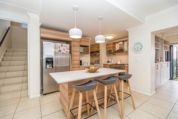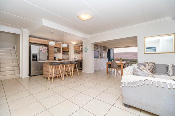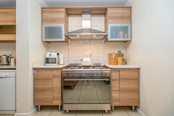 Inside, you are welcomed by an open-plan lounge and dining area filled with natural light. The enclosed patio, fitted with stacking doors and roller blinds, creates the perfect indoor-outdoor flow leading to the private garden. The modern kitchen boasts ample cupboard space, a SMEG gas oven and stove, and a separate scullery with room for three appliances. A guest loo is conveniently located on the lower level.