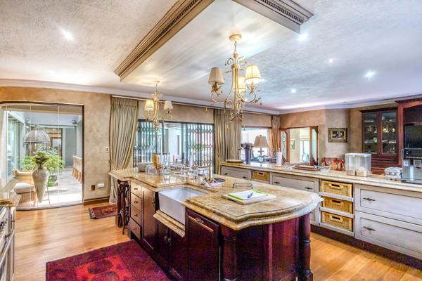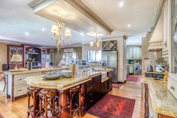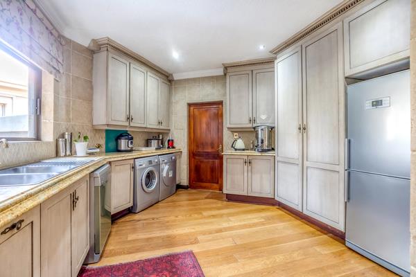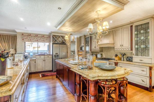 A designer gourmet kitchen with granite countertops, gas hob, electric oven, massive walk-in pantry, and a separate scullery/wash-up area.
