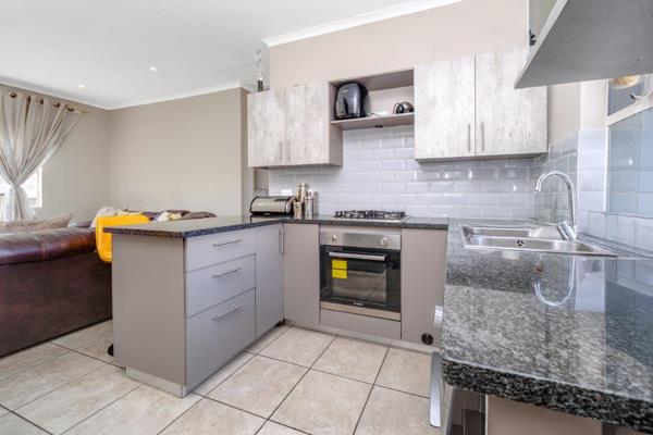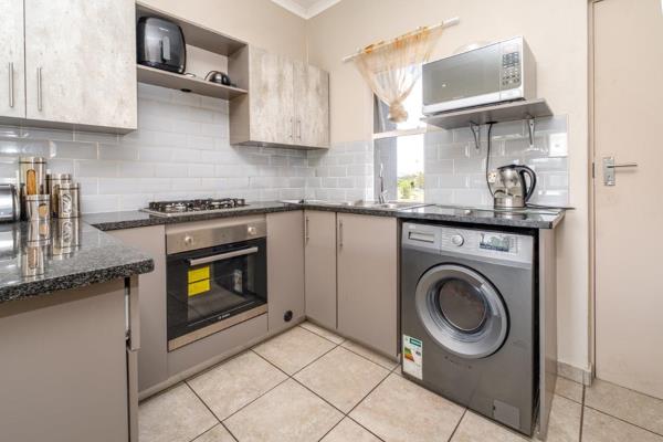 Open Plan Kitchen: The small open plan kitchen with a gas stove has granite countertop which leads to a lounge, perfect for modern living.