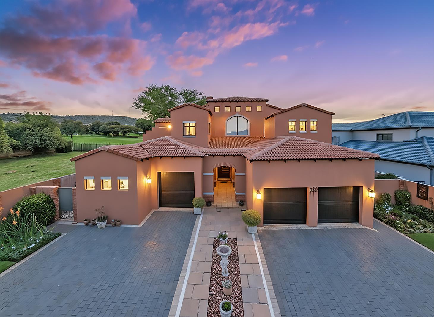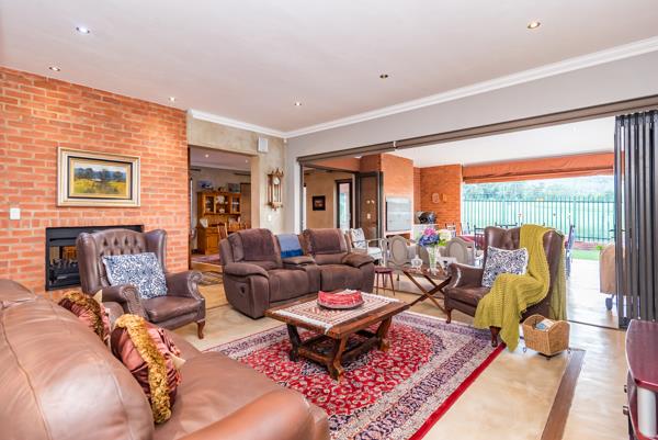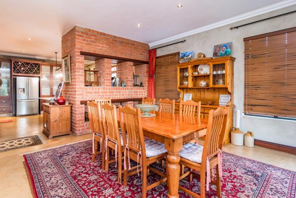 At the heart of the home, a gas fireplace between the kitchen and lounge creates a cosy winter atmosphere, while in summer the living spaces open through stacking doors onto a covered patio complete with a built-in braai, basin and cupboard space. From here, enjoy tranquil views over the lush green garden, sparkling swimming pool and the Ruimsig Golf Coursean entertainers dream and a family haven.