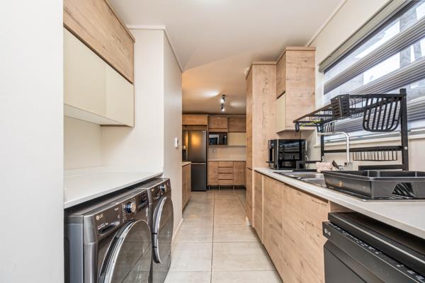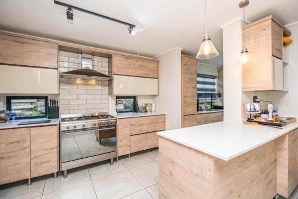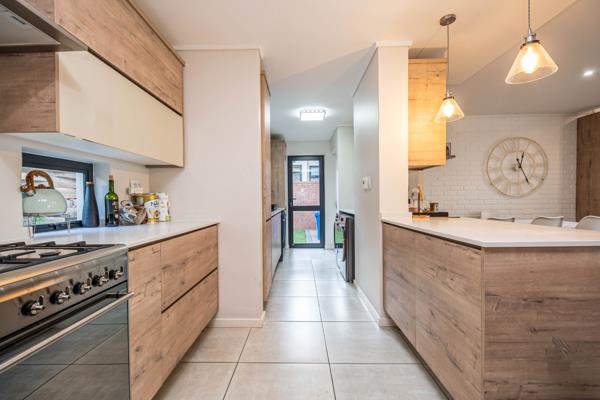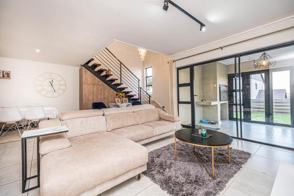 The heart of the home is the open plan kitchen, thoughtfully designed with quality finishes and complemented by a separate scullery for added functionality. The kitchen flows seamlessly into the open plan lounge and dining area, which offers generous additional cupboard space and creates a welcoming environment for everyday living and entertaining. An enclosed patio with stacking doors and a built in braai extends the living space and opens onto a wrap around garden, perfect for hosting gatherings or enjoying outdoor relaxation.