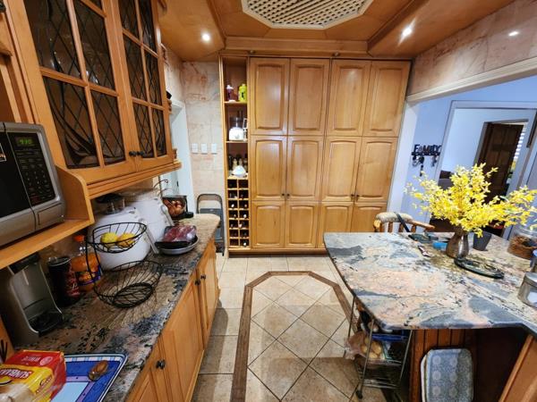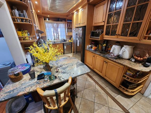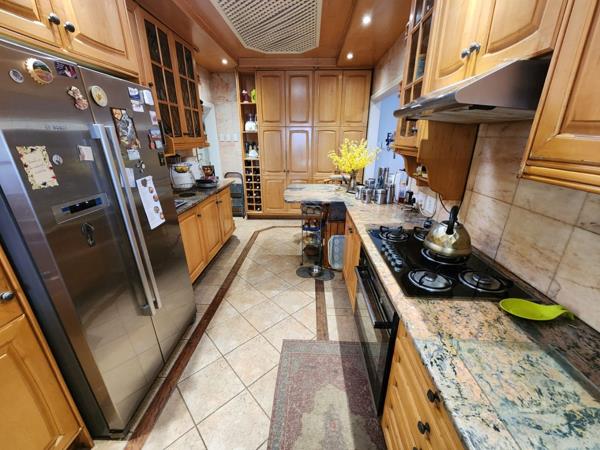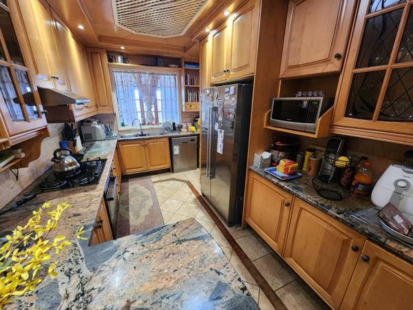 Modern kitchen with ample kitchen units for all the appliance, granite countertops, ample solid wood cabinetry and gas hob,