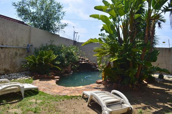 The spacious covered patio, complete with a built-in braai, offers a seamless view of the sparkling swimming pool, lush landscaped garden, and inviting boma area and mdashperfect for family gatherings and relaxed outdoor living.