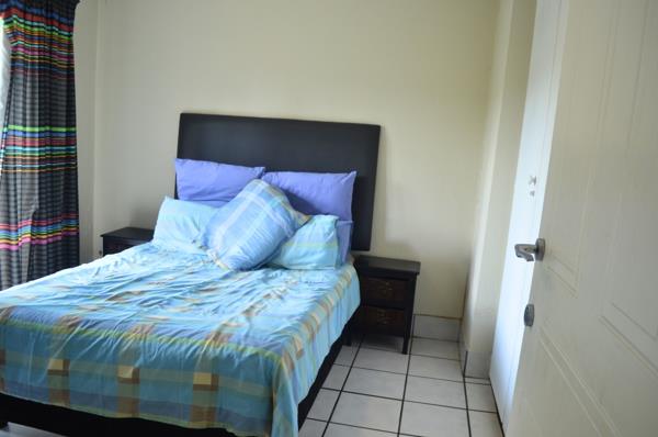 Enjoy air-conditioned bedrooms with wooden laminate flooring, a main en-suite, and ample cupboard space. The open-plan living areas are tiled throughout and flow seamlessly into a modern kitchen with a built-in oven, hob, and a separate scullery.