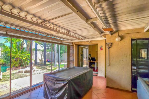 The covered patio with bar area extends the living space outdoors with adjacent sliding door into study room, overlooking a beautiful garden with rock pool.