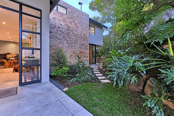 Stacking glass doors open out to a serene, storybook garden where lush greenery and tranquil surroundings create the perfect outdoor retreat.