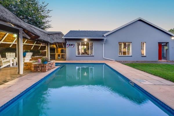 An expansive lapa with built-in braai and pub area, overlooking a sparkling heated pool and lush landscaped garden the ultimate backdrop for relaxing weekends and festive gatherings.